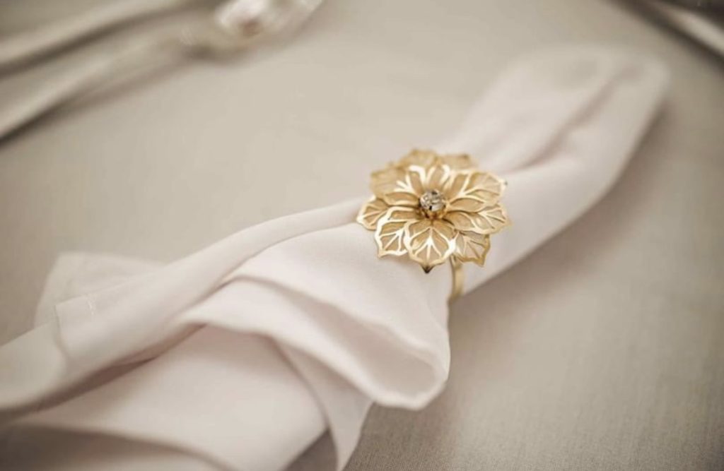Gold flower serviette holder with clear gem in the middle.