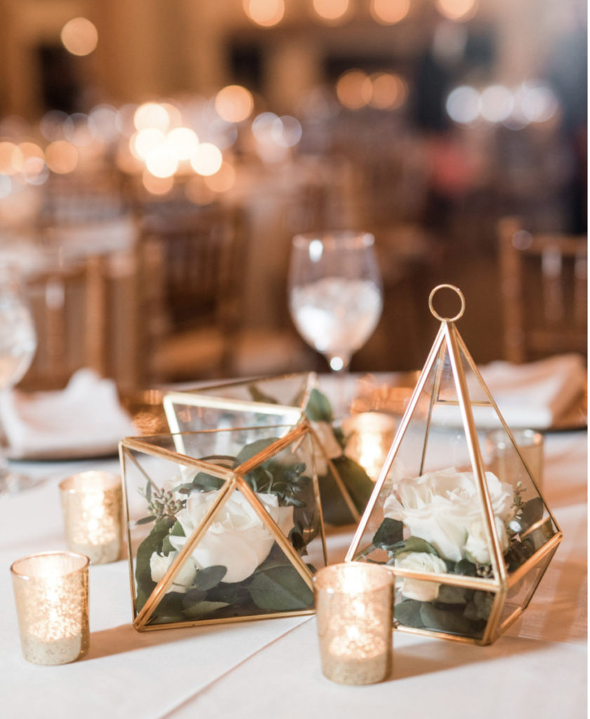 Gold and glass terrariums for centrepieces